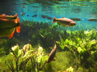 Aquário de Bonito, que oferece aos visitantes a oportunidade de conhecer de perto mais de 60 espécies de peixes, em um ambiente temático que reproduz o habitat da fauna e flora subaquática da região da Serra da Bodoquena e Pantanal.